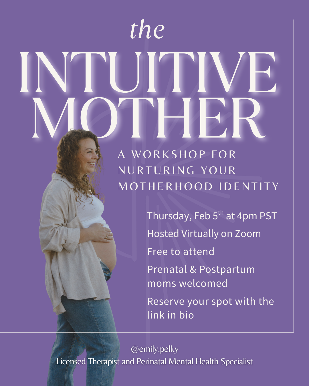 The Intuitive Mother is a workshop designed for pregnant and postpartum mamas to tune into their inner wisdom, connect with their future selves, and reflect on the emotional journey of matrescence. Through intentional conversation, journaling, and guided meditation, you'll explore how your own inner child shapes the way you want to mother. You’ll also be provided space to care for your mind and spirit through your motherhood journey.